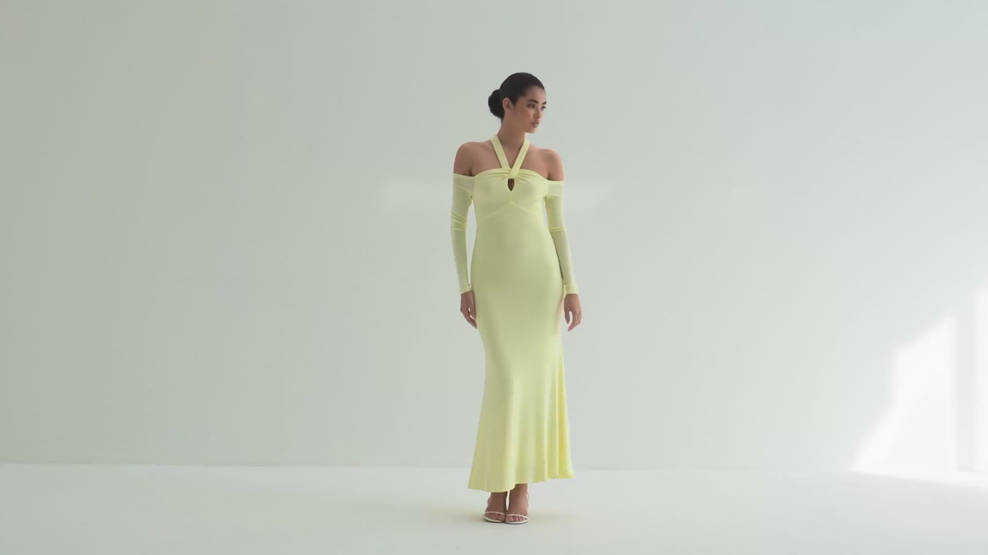 - Halter knit gown with off-shoulder sleeves