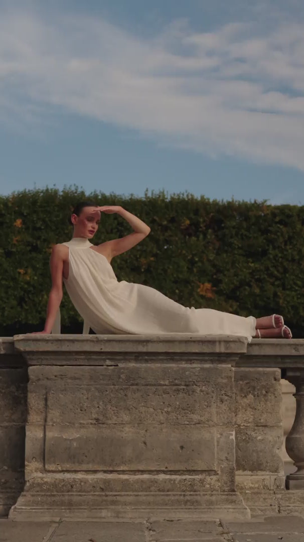 A floor-length viscose dress with a softly ruched high neckline and long back ties. Wear with flat sandals for day; switch to heels, statement earrings, and a clutch for night.