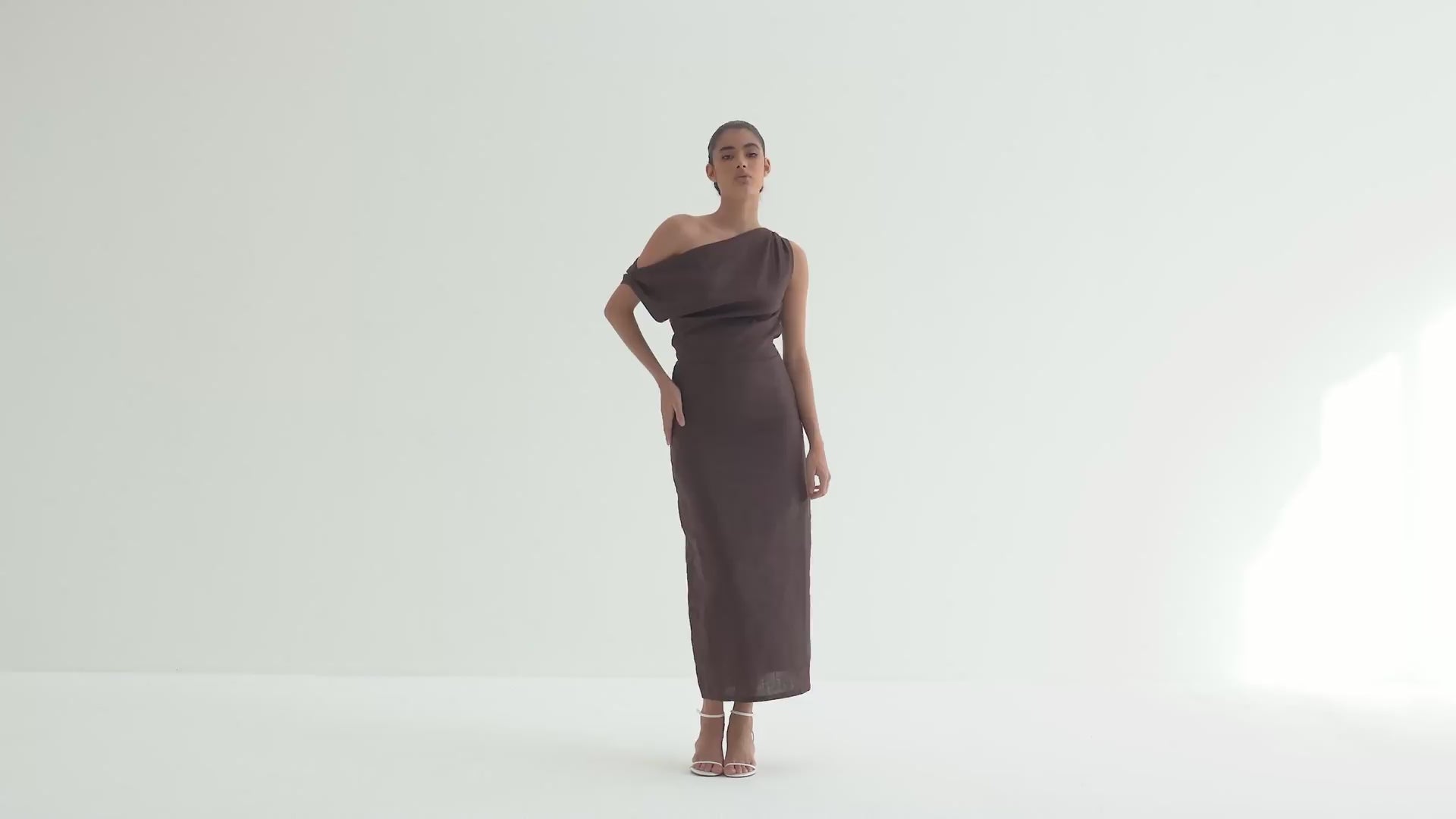A sleeveless dress with asymmetric drape and gentle waist gathering. Style with pointed heels and minimal jewelry for a polished day-to-evening look.